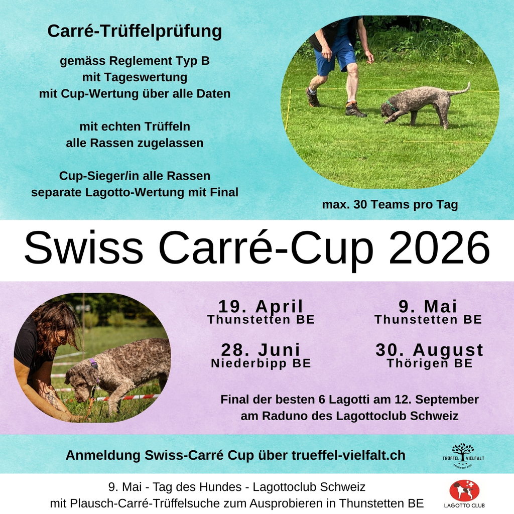 Ab 2026 gilt das offizielle Reglement. Deshalb wird nun eine Lizenz pro Hund für den Start an Carré-Prüfungen benötigt. Die Lizenzgebühren von CHF 5.- werden automatisch durch Trüffel-Vielfalt mit der Anmeldegebühr eingezogen und an den Lagotto Club Schweiz weitergeleitet. Die Lizenz ist jeweils im ganzen laufenden Kalenderjahr gültig.